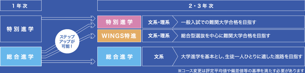 学力や希望進路に応じて、2年次から「WINGS特進」にステップアップすることも可能です。